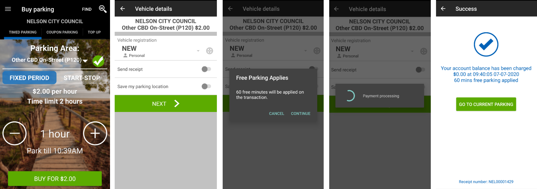 Free parking is applied when you select the vehicle to be paid for, which is the second screen of the purchase flow.